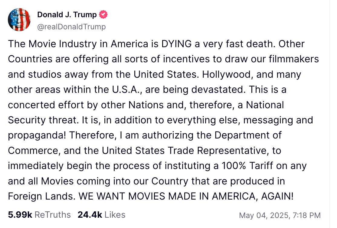 This latest tariff call is particularly problematic because Trump is seeking to justify it as a “national security threat.” How is the fact that other countries make movies or that Hollywood is choosing to produce films overseas a “national security threat,” particularly when the US has a trade surplus from film exports?